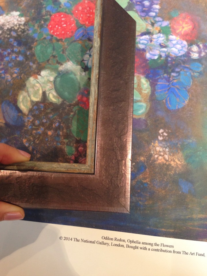 Finding the right picture frame for my favorite print proved difficult yesterday. The poor framing tech did her best to help me choose, but in the end I decided to remain undecided. I have to come back in after they stretch the canvas to make the final decision between these two.