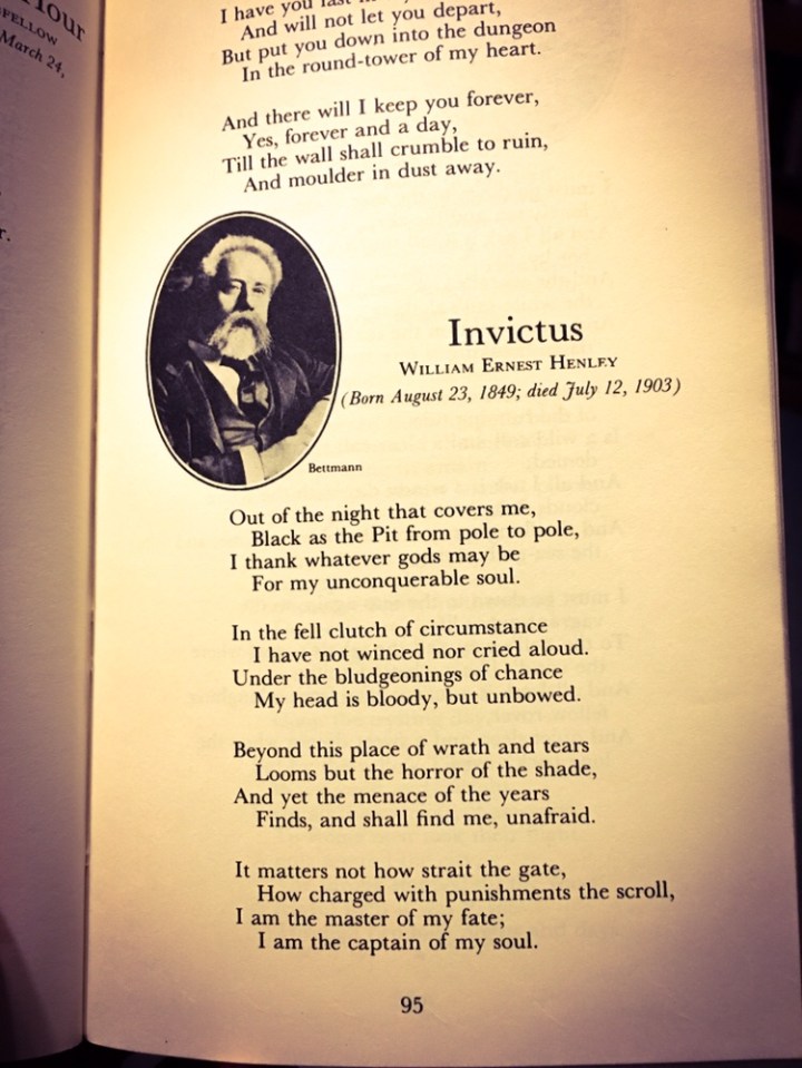 I came across this old book of poems on my father’s bookshelf today. It was one of his college texts, and I’d often leaf through it when I was a girl, paying close attention to the poems he marked up in pencil. My favorite back then was Trees by Joyce Kilmer (‘I think that I shall never see a poem lovely as a tree…’), but tonight this one stood out instead. Especially the final lines: ‘I am the master of my fate; I am the captain of my soul.’