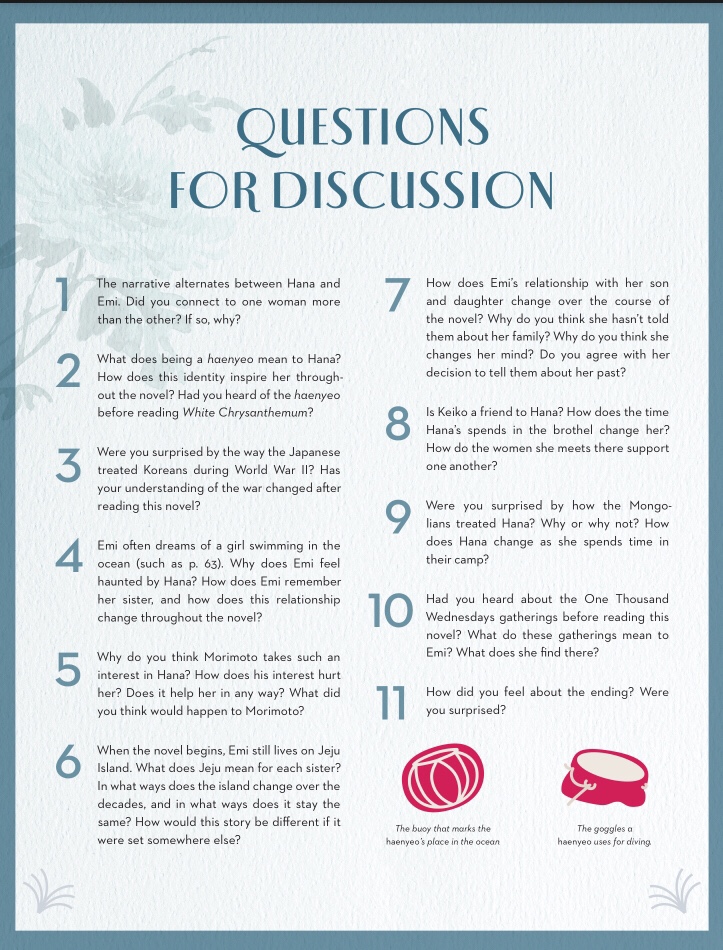 Here’s the beautiful new cover and book club discussion questions for the paperback launch of White Chrysanthemum this September. My publishers have done an amazing job, and I’m honored to share the tragic story of the Korean ‘comfort women’ with readers everywhere.